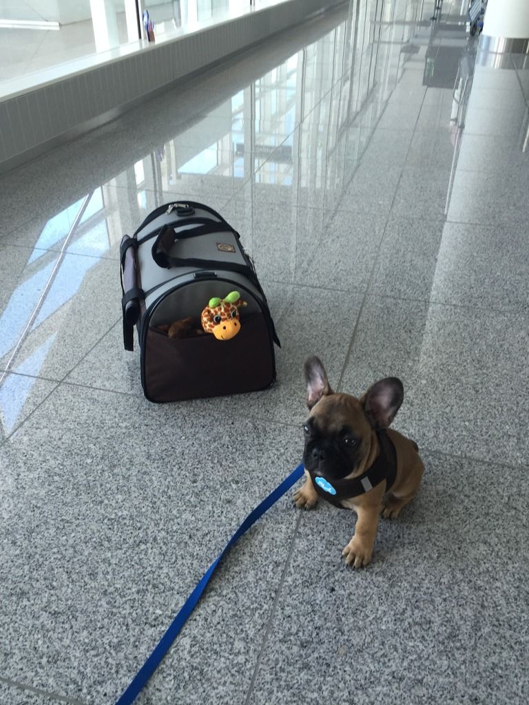 I was super nervous about the flights, but he was an absolute champ and didnt cry once. He slept through most of it. I took him to the lavatory twice ,which was quite the situation being cramped in there with a puppy,his carrier and a pee pad, trying to make him go . Haha.