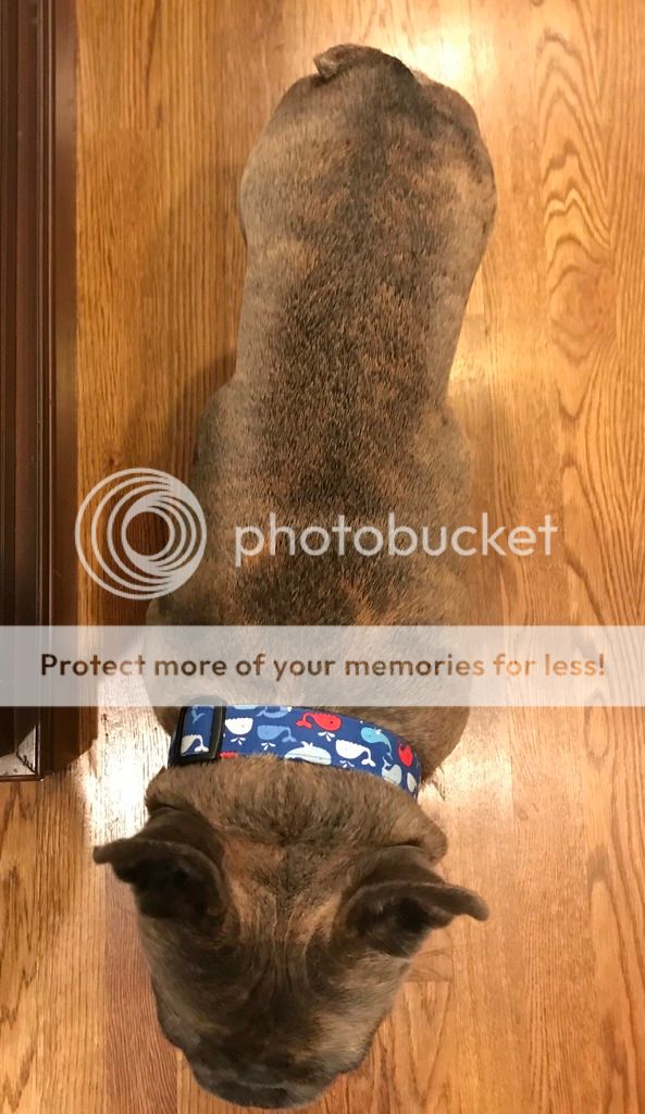Since starting raw a few weeks ago, my husband and I both think Daphne looks like she may have lost a little weight. She fluctuates between 26-28 pounds (on former vet's scale). These aren't the greatest pics, but does she look like she's at a healthy weight? I can see a slight play of her ribs. I feed her 1/2 a frozen patty plus one crushed up nugget and goat's milk, twice per day. Daphne gets small treats every time she potties outside and when she goes into her crate at night. She does seem hungry throughout the day and hangs out under my daughter's seat at the table. Is that a Frenchie thing or do you think I am not feeding her enough?