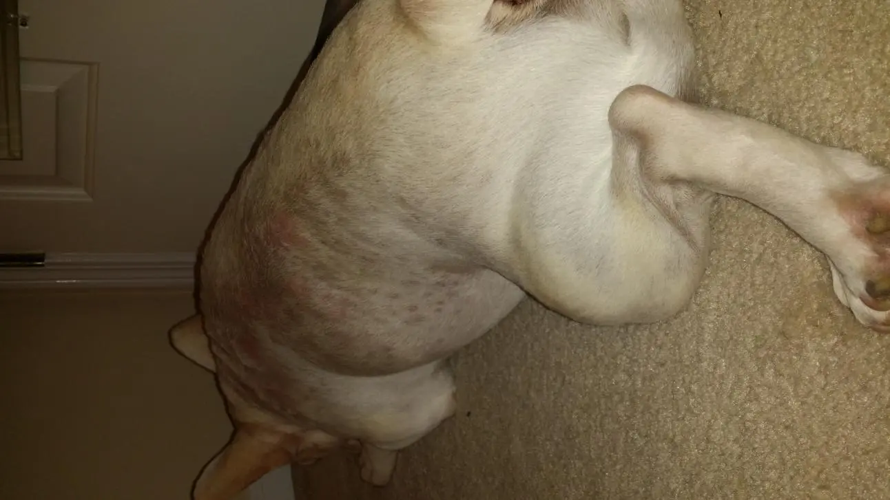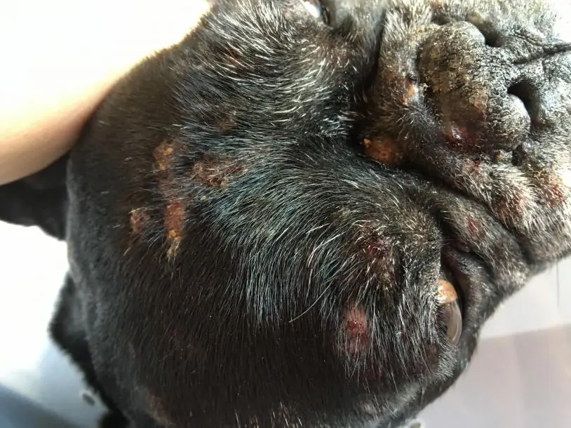 can someone help me identifying this skin problem on my french bulldog? the vet has given her all what he thinks she needs but it seems not to stop, will get better a day or two and it reappears worsened. She has even got ozone therapy. She´s had it for more than 6 months. I´ve followed all recomendations given by vet about food, cleaning, bathing, etc