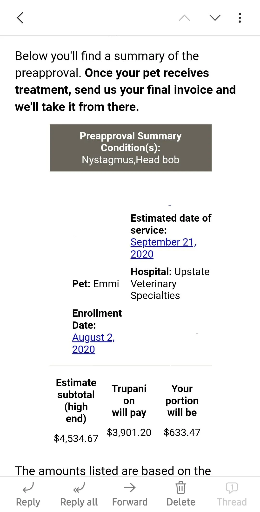 I cannot praise trupanion enough. They have been great with me for Emmi's recent health issue and I can say I never thought I'd be facing at 5 months old. They even gave me a pre-approval and this is only for an MRI. We have only had this insurance for 2 months and customer service has been outstanding!View attachment 14189