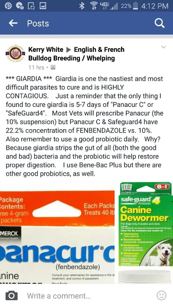 (2) went to the vet and she had him on metronidazole and panaruc for 2 weeks-fecal test came back with Giardia