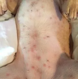 Could be environmental allergy or food allergy. Jax broke out in a rash and got bumps when I tried out turkey. I would try a different protein other than chicken as chicken can be a common allergen.
