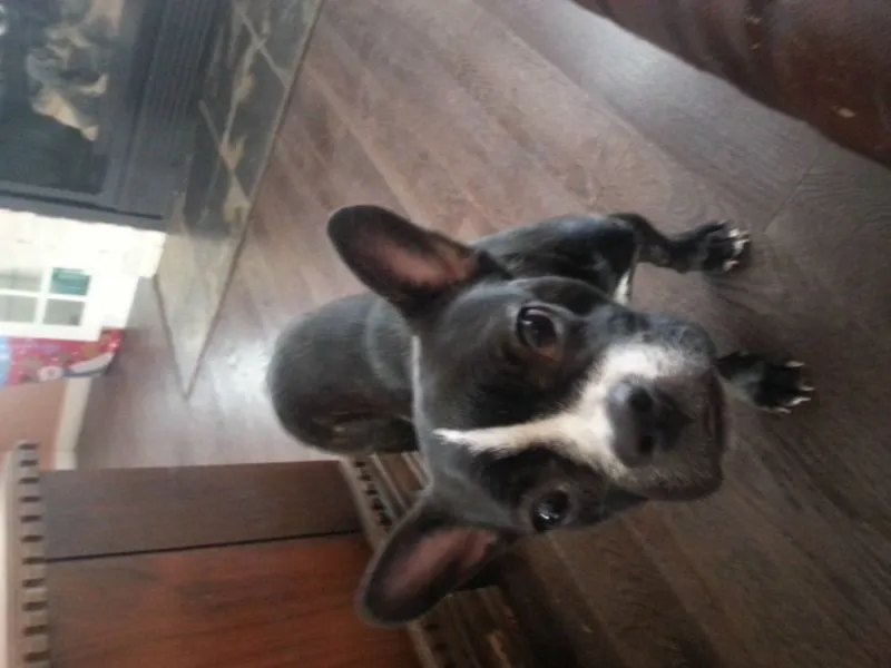 To me personally, I think it looks more Frenchie then Boston. Bostons tend to have the more triangular shaped ears and skinnier body frame. This little guy has the round big bat ears and stocky body? Color and Markings really don't have anything to do with the french bulldog breed, seems like they come in all different colors.