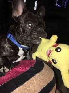 March Frenchie of the Month contest "Frenchie Faces" My Frenchie goes Pokeman hunting and he caught a Pikachu.