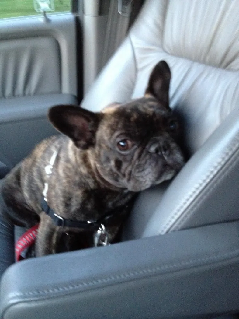 Doggie seat with clip in to harness. Front seat. Yesterday after a frenchie playdate!
