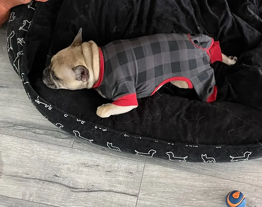 Jelly loves is red sweater, however, we had to cut it to shreds to get it to fit him in the neck. It's pretty oddly fitting but he loves it. I will check out Lazy One. I'll find some good pictures of Jelly and send under sep. cover.No Rusty doesn’t pee on these PJs.