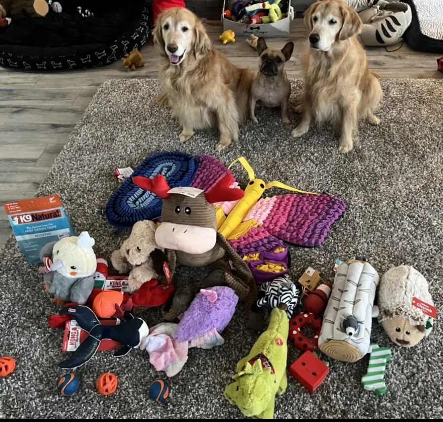 Rusty got pajamas from my parents, and the bottom photo is all 3 of my dogs with all their Christmas toys they got including the 2 snuffle mats behind the reindeer(blue one+the butterfly).