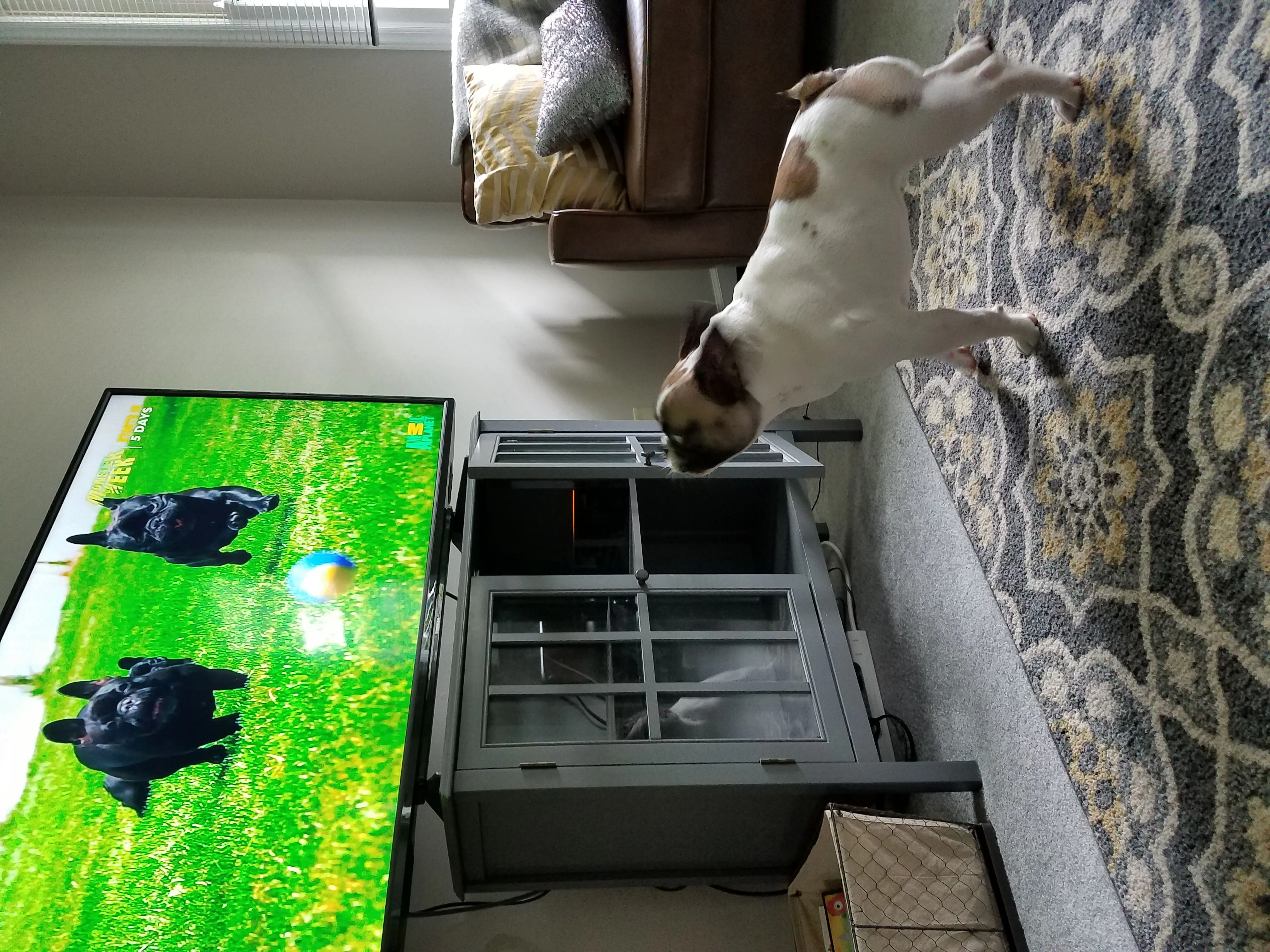 Wally LOVES TV!! He especially likes hockey, soccer, any nature show, action movies and animated movies. He actually watched the entire movie Secret Life of Pets like a toddler, 2 feet from the TV. Mel is his spirit animal.I turned the pic into a cartoon.