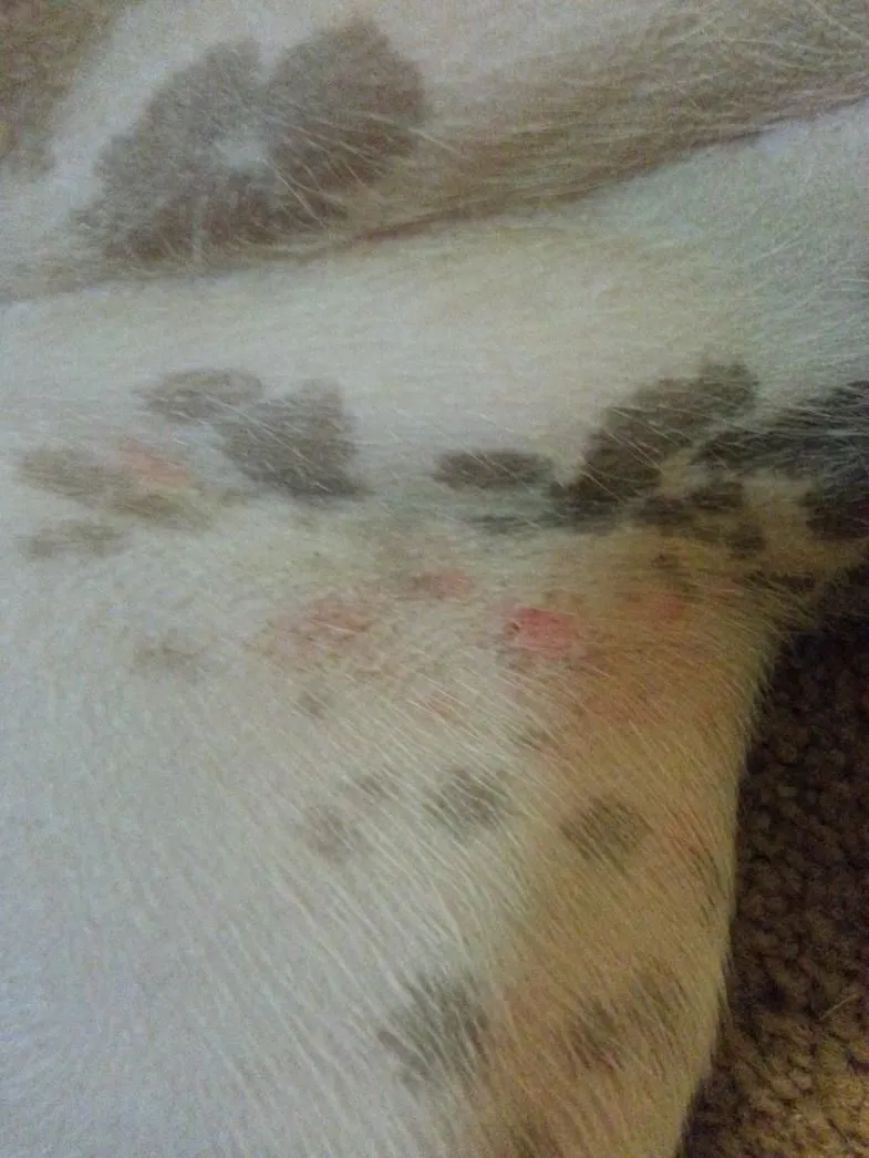 I had thought initially it was a reaction to something at the beach, but she's been today and is as happy as can be. Still has redness but no more patches, we've been helping to ease her wiggles with some Hydrocortisone lotion (We decided to try a topical route + food switch before opting for another shot and more pills. This seems to be helping so we're hoping we can forego another round of heavy medicine.)
