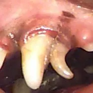 Teeth that are crowded or tilted at abnormal angles can result in early onset and increased severity of oral infection, may damage the soft tissues of the mouth, due to sharp teeth that penetrate the unprotected gum and mouth tissues. In addition, the lower canines can erode through the hard palate/roof of the mouth, causing food to enter the nasal cavity, excessive wear when abnormally aligned teeth grind against each other. Such abrasion frequently wears through enamel, causing a weakened tooth to fracture and expose the root canal system causing pain, and early teeth loss.
