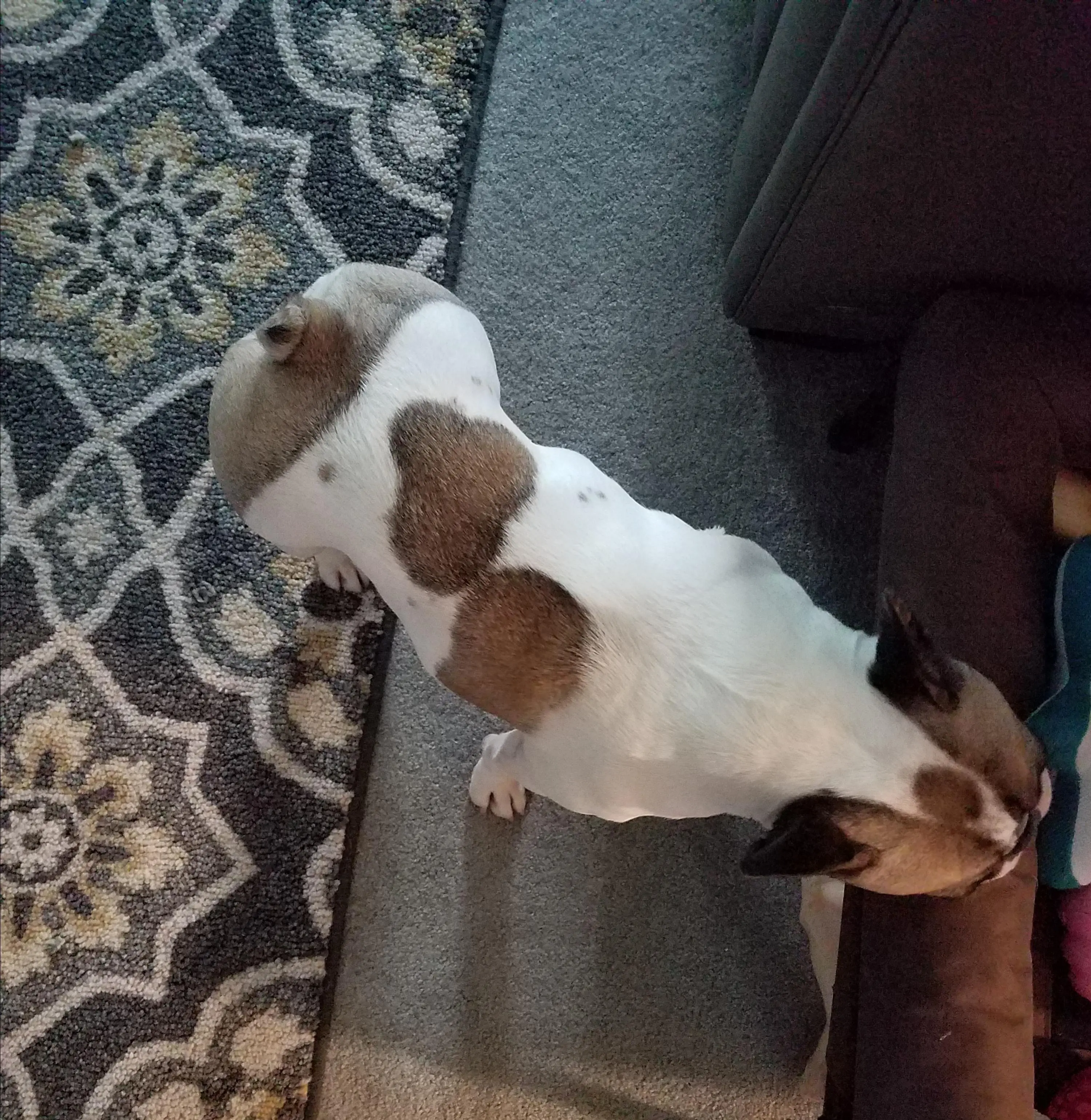 Since starting raw a few weeks ago, my husband and I both think Daphne looks like she may have lost a little weight. She fluctuates between 26-28 pounds (on former vet's scale). These aren't the greatest pics, but does she look like she's at a healthy weight? I can see a slight play of her ribs. I feed her 1/2 a frozen patty plus one crushed up nugget and goat's milk, twice per day. Daphne gets small treats every time she potties outside and when she goes into her crate at night. She does seem hungry throughout the day and hangs out under my daughter's seat at the table. Is that a Frenchie thing or do you think I am not feeding her enough?